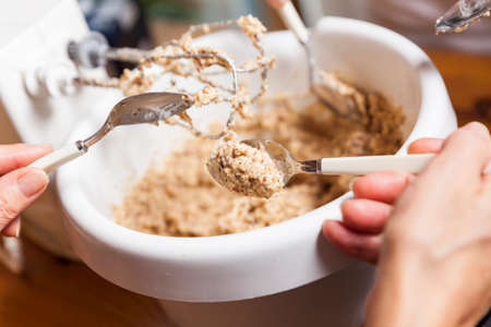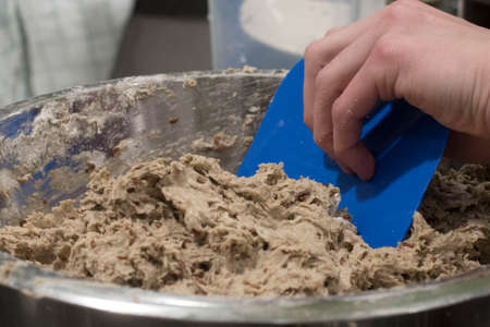 Working baker checks automatic kneading of dough for texture, water, flour and yeast