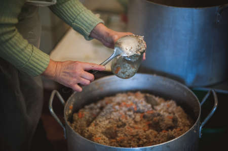 Uzbek plov (pilaf) is being prepared in giant kazan, Tashkent, Uzbekistan. The signature dish of Uzbekistan is cooked with rice, meat, carrots and onions. Pilaf is a traditional food at Central Asia.