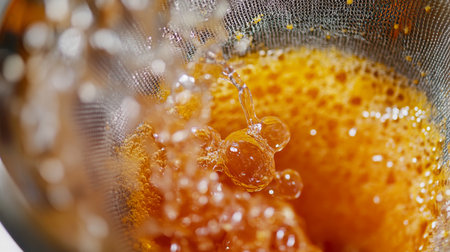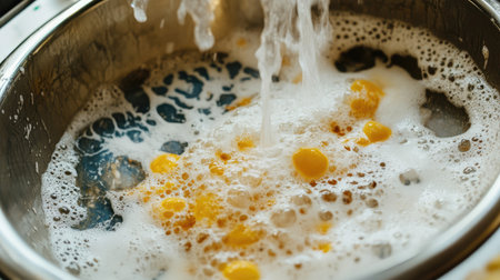 A captivating close-up image capturing fresh eggs being whisked with water in a metallic bowl, creating frothy bubbles and a lively kitchen atmosphere.