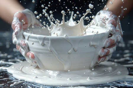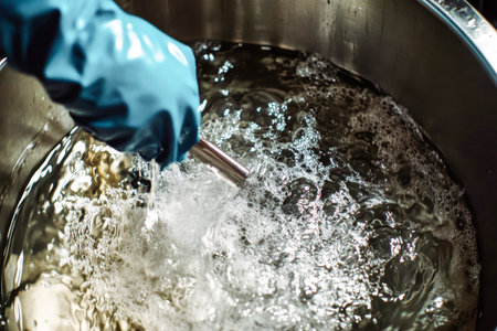 A close-up of a focused artisan skillfully working with water in a vibrant kitchen, showcasing hands immersed in the preparation process, highlighting craftsmanship and culinary art.