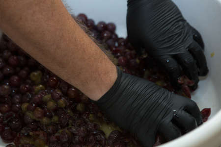 The process of making homemade wine. Male hands squeeze juice from grape berries. The concept of making craft drinks.