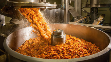 A dynamic view of large-scale mixing of vibrant spices in a metal bowl, showcasing the machinery involved in food production and preparation.