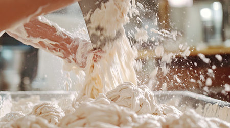 A dynamic scene showcasing hands vigorously mixing whipped cream in a well-lit kitchen, capturing the creamy texture and joyful motion of food preparation.