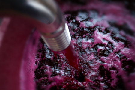 Freshly squeezed grape juice during food and wine festival. Traditional Romanian sweet drink, sugar free, intense red color
