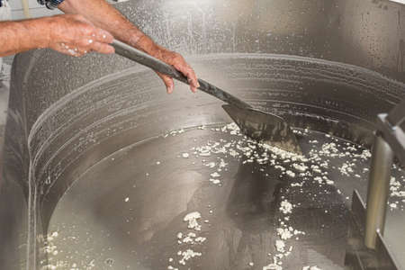 A woman working in a small family creamery is mixing a cheese batch. The dairy farm is specialized in buffalo yoghurt and cheese production.