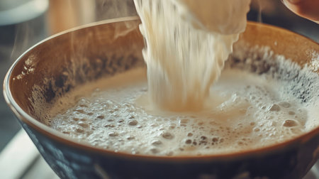 A hand is adding dry ingredients to a bubbling mixture in a bowl, creating an enticing atmosphere in a warm kitchen filled with savory aromas.