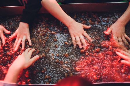 wine preparation. A woman crushes Isabella black grapes with her hands, squeezing out the juice.