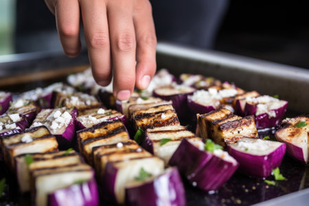 hand skewering grilled eggplant cubes for kabobs, created with generative ai