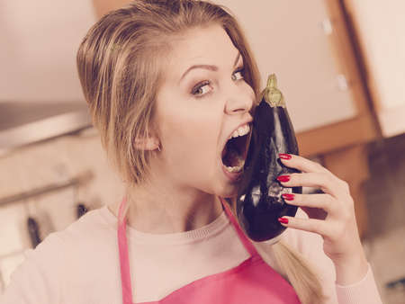 Vegetable having good impact on teeth. Young woman eating biting delicious eggplant.