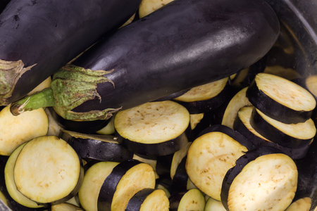Ripe raw whole and sliced into circles purple eggplants in kitchen bowl close-up