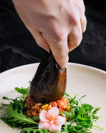 Chef at the kitchen preparing grilled eggplants with garlic