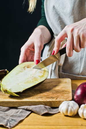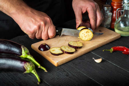 The chef is slicing the eggplant on a wooden cutting Board. Side view, space for text. The concept of cooking baked eggplant.