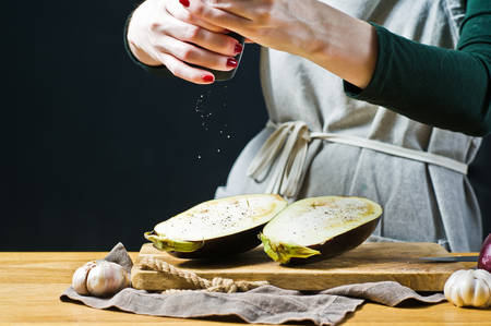 Girl preparing food on a table from eggplant