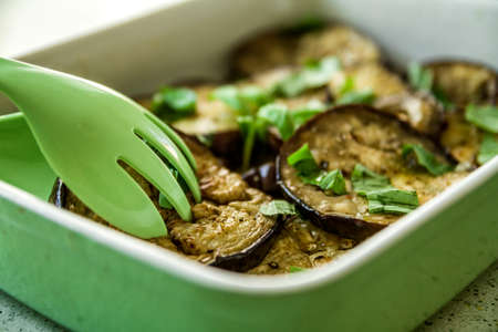 Fried and cooked aubergine with garlic basil in olive oil in bowl