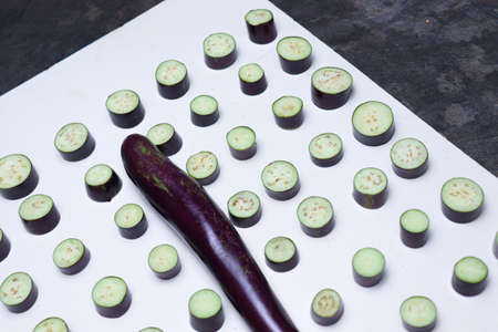 sliced brinjal stock on white background for cooking