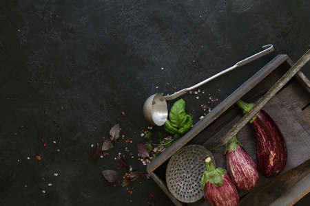 Composition with fresh eggplants on dark background