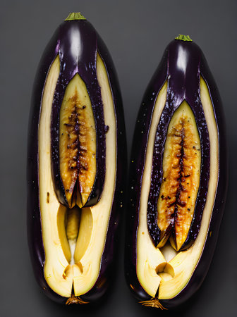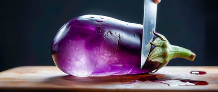 Transparent eggplant, cut in half, like a crystal with a faceted surface, Cut with a knife