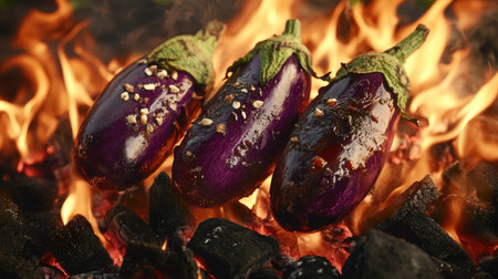 Roasting eggplants directly on glowing wood coals, flames licking at their surfaces, creating a perfect base for smoky puree.