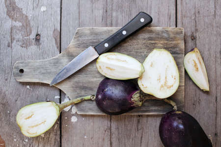 Close up of fresh purple whole eggplant and sliced over an aged wood table. Photographed with light painting technique.