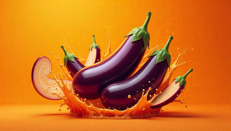 Eggplants amidst splash of juice on orange background