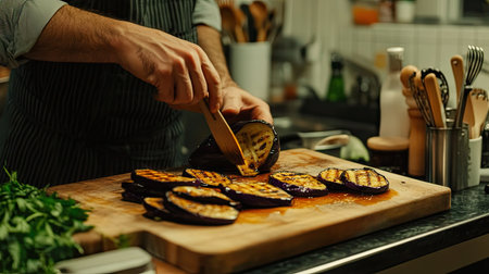 A kitchen scene with a chef slicing grilled eggplant and drizzling sweet miso sauce, the countertop filled with cooking tools