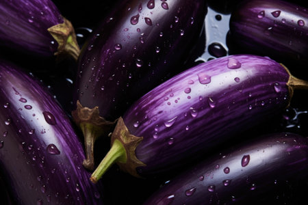 Heap of fresh eggplants with water drops background. Vegetables backdrop. Generative AI.