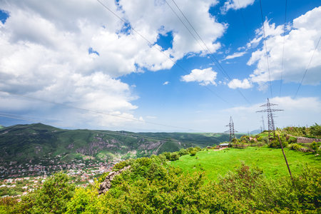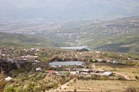 Beautiful landscape of village with green hills and cloudy sky in sunset. Exploring Armenia