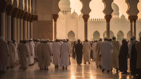Religious Muslim people praying in the mosque. Ramadan celebration