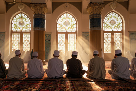 A group of Muslims reading the holy book of the Quran in a modern mosque during the Muslim holiday of Ramadan