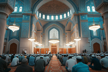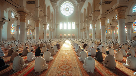 A large group of Muslims gather in a mosque for prayer, a serene and spiritual moment of unity and devotion. The image captures the essence of faith and the importance of community in Islam.