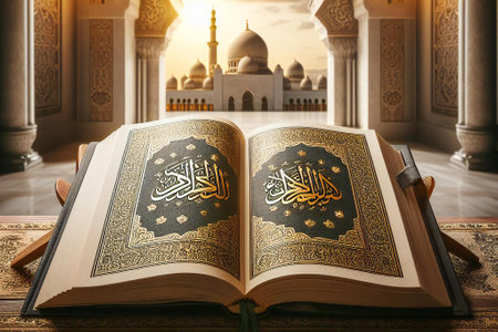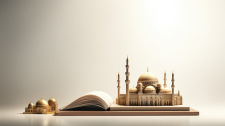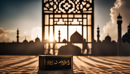 A holy book rests on a bed of sand with a silhouette of a mosque framed by a window behind it. The image evokes a sense of spirituality and peace.