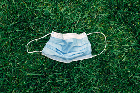 Used sanitary mask lying on grass ground. Disposable recyclable face mask flat lay. medicine and seasonal allergy concept. View from top above overhead.