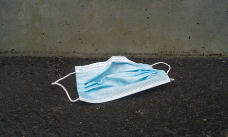 Medical face mask on floor street pavement. Virus protection healthcare item equipment. used. Dirty.