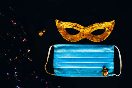 Carnival mask and protective medical mask on a blue background. New Years Eve party celebration in COVID-19 reality. Party outfit.