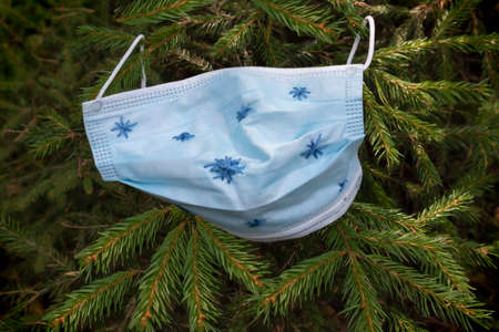Hyenic mask with embroidered snowflakes on the background of fir branches. Christmas holidays coronavirus concept.