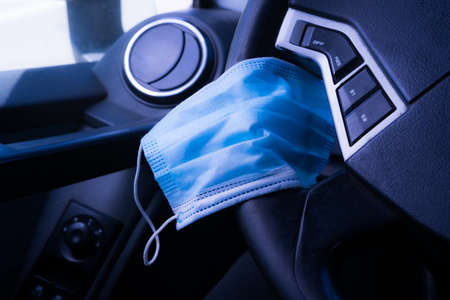 A surgical mask on a steering wheel inside the car