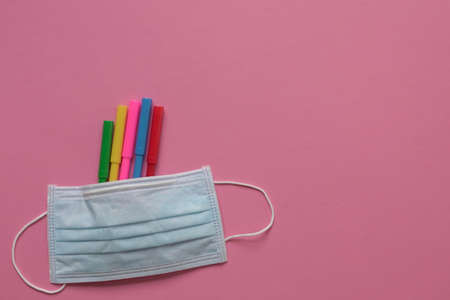 Medical protective face mask on different color background, personal hygiene, health care, corona virus, covid 19, medical.Top view.