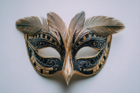Close-up image of a decorative carnival mask with intricate gold and black designs, accented by elegant feathers. The mask is presented against a neutral background, highlighting its detailed craftsmanship.