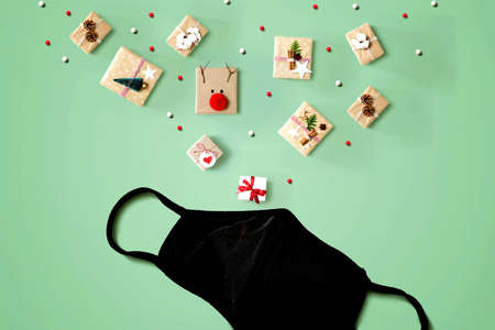 Christmas in times of coronavirus. Surgical mask over christmas lights in the dark. Covid-19