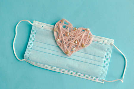 Pink knitted heart and medical mask on blue background. Valentine's Day during the pandemic. Happy Valentine's Day 2021
