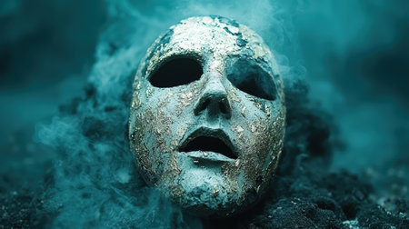Mysterious frozen mask in icy fog