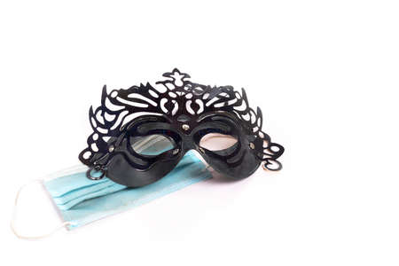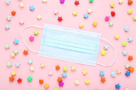2020 and 2021 year on protective face mask. Top view of 2020 and 2021 year numbers on medical mask with copy space. Happy and safe new year concept