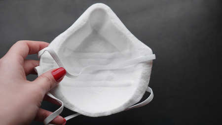 Female hand with a red manicure holds a respirator. Protection against pollution or disease. Epidemic and virus concept