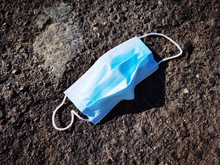 Medical face mask on the floor in the street.Used Surgical masks haphazardly strewn on pavement.Improperly discarding used face mask. Lost face mask at pavement