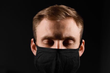 Handsome man in black t-shirt wear black medical mask, gray background. Coronavirus covid-19 quarantine period concept