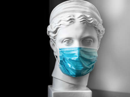 Plaster copy of the head of the ancient statue of Diana on a light textured background. The face of a woman with a plaster of Paris sculpture in a medical mask. Front view. Covid-19 virus. Pandemic 2020