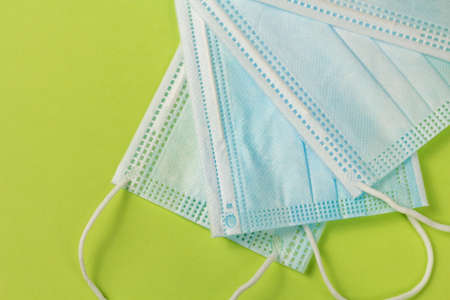 Blue medical face masks on a green background. A set of medical masks. Medical respiratory bandage face. Prevention of virus, pandemic Covid-19. Quarantine, stay at home