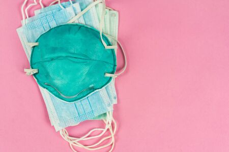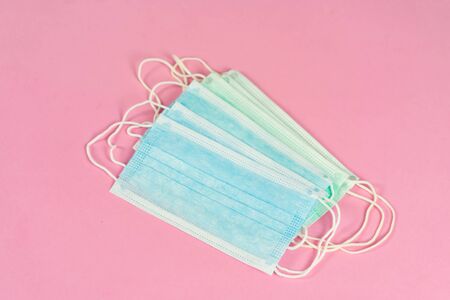 Medical protective masks on a pink background. Disposable 3-ply medical mask to cover the mouth and nose to prevent coronavirus. Coronavirus quarantine. Antivirus medical mask for protection covid-19.