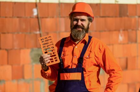 Element in masonry construction. Builder hold brick. Bearded man wear hard hat at construction site. Brick building material used to make walls. Lightweight brick made from expanded clay aggregate.
