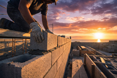 A male construction worker wearing protective gloves kneels on wooden scaffolding to place a heavy concrete block onto a new wall structure against a colorful sunset sky.
